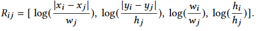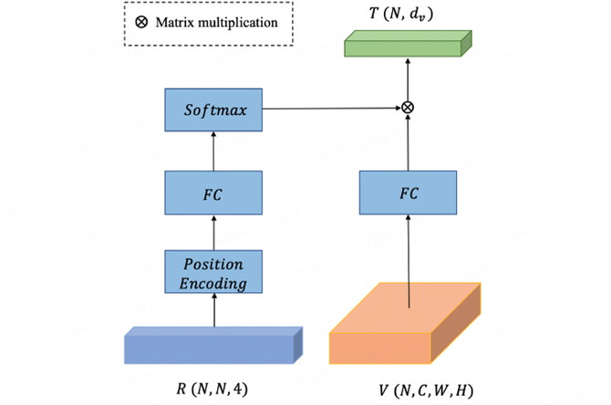 为了加强 RoI特征感知彼此的位置关系,我们设计了几何关系感知模块(GRAM)让模型更好的学习布局元素之间的内容信息。具体细节如下:首先,给定 ? 个 RoIs,两个RoI ?? 和 ?? (?, ? ∈ {1, 2, . . . , ?})的相对位置特征 ??? 计算方式如下: