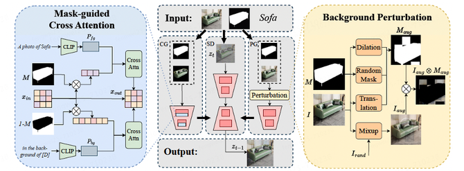 其中,Xin与Xout分别表示注意力模块的输入、输出模块,CA()表示常规的注意力模块,•表示点乘符号。经过训练后,每个类目的背景风格被映射且仅被映射到到对应的D中。因此,在推理时,给定类目名称C,模型可以通过固定的映射关系得到其对应的D,并将D作为提示词用来生成符合该类别背景通性的背景,从而减少复杂的提示词设计。