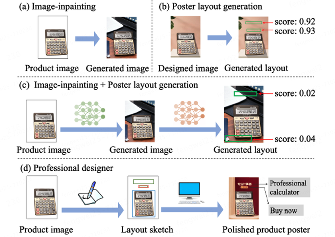 目前尚无端到端商品海报生成技术,与其较为相关的两个领域为图像填充以及商品海报布局生成。如下图(a)所示,图像填充技术可以根据已有的商品图像,自动生成商品的背景区域。如下图(b)所示,商品海报布局生成技术可以在人类设计师产出的海报上,寻找可放置视觉元素的位置。因此,简单的将两个任务串联起来可被视作一种实现端到端商品海报生成的基础方案。