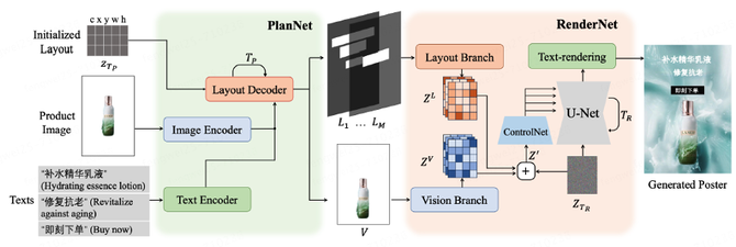 受上述分析启发,我们提出了一种基于规划和渲染的端到端商品海报生成方法,借鉴了人类设计师的工作流程来完成海报生成任务。所提出的方法框架如上图所示,其中包含一个规划网络PlanNet和一个渲染网络RenderNet。对于PlanNet,它首先编码商品图像和文本内容,之后使用布局解码器(Layout Decoder)将二者融合来产生更合理的布局结果,最终它预测了商品和其他视觉元素的位置。对于RenderNet,它将PlanNet生成的布局还有商品图像共同作为生成过程的控制条件。首先它利用了一个空间融合模块来学习不同视觉元素的空间位置关系;之后对商品外观进行编码,使得生成的背景和商品是和谐的;最后它将两个控制条件输入给ControlNet,用于指导Stable Diffusion的生成过程。结合上述技术优势,我们实现了一个图片质量较高且多样化的商品海报生成方法。