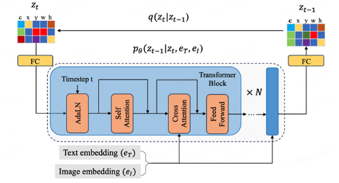 其中,规划网络的目的是将输入的随机布局,经过多步的迭代去噪,采用布局解码器转化成最终视觉元素的布局位置。如下图所示,对于第t步来说,布局解码器的输入包含三部分:t时刻的布局结果zt,提取好的视觉和语言特征;输出为t-1时刻的布局结果z(t-1)。它的详细结构包含两个全联接层(FC)和N个transformer模块。首先,zt被一个FC层映射为一个元素表征et;之后经过N个transformer模块,处理后的元素表征被另一个FC层解码为zt-1。在每一个transformer模块,时间步t和元素表征et被一个自适应归一化层(AdaLN)和一个自注意力层(SA)处理。之后,交叉注意力层(CA)被用于计算自注意力层的输出,以及视觉和语言特征。