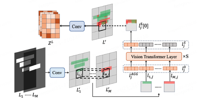 如上图所示,该模块首先使用三层卷积网络将{Lm}编码,编码后的特征形状为C×H×W。之后将编码后的{Lm}融合为一个统一的布局表达L’。具体来说,编码后的{Lm}被切分成多个切块{lm,j},其形状为C×P×P,j是块的序号,它的范围是1到W×H/P/P。为了得到L’的第j个切块,我们对编码后的{Lm}的第j个切块进行融合。融合后的特征被输入到S层视觉transformer中。最终,一个三层卷积网络被用于得到最终的布局表征ZL。
