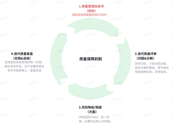 质量保障机制的框架描述为:以质量管理白皮书澄清阶段的质量目标,具象化地定义相应的执行规范、要求;在迭代过程中应用迭代质量评审,于准出前识别风险并做下钻归因诊断,形成风险降级或风险规避的具体措施,并加以在上线前落实;最终,通过迭代质量复盘,还原过程典型现场,举一反三;同时,以线上运营结果校准/修正目标及其配套规范的适配性。