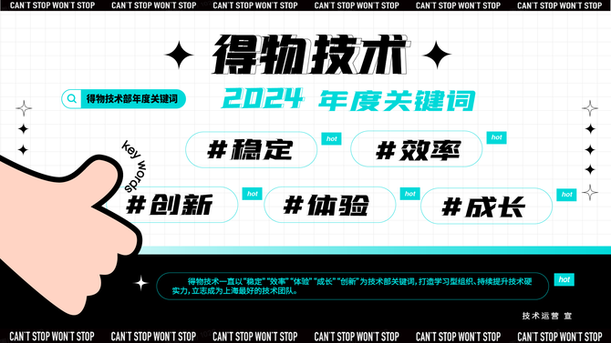 得物技术“关键词”作为官方划的重点,是纷繁复杂工作开展的价值判断依据,亦是阶段复盘总结的中心思想,更是有效业务支撑的前哨与灯塔,指引技术工作做对、做好。以终为始,围绕“关键词”不懈实践,持续收获。