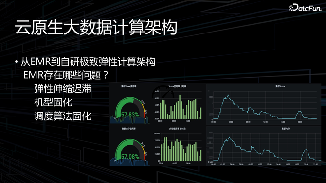 资源调度优化,核心在于计算架构资源。自研架构下,资源利用率弹性效率高,每个小时都有一个波峰波谷,平均物理资源利用率达到 80% 以上,长时间维持在 80-90% 上下。