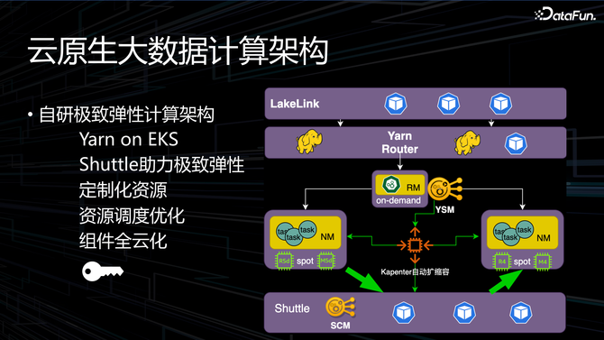 为了解决上述问题,OPPO 自研了极致弹性计算架构——Yarn on EKS。EKS 是AWS 提供的托管型 Kubernetes 服务。Kubernetes 难以满足大规模快速调度的需求,无法做到快速调度、机器可掌控、资源可控制。因此我们选用了 Yarn on EKS。