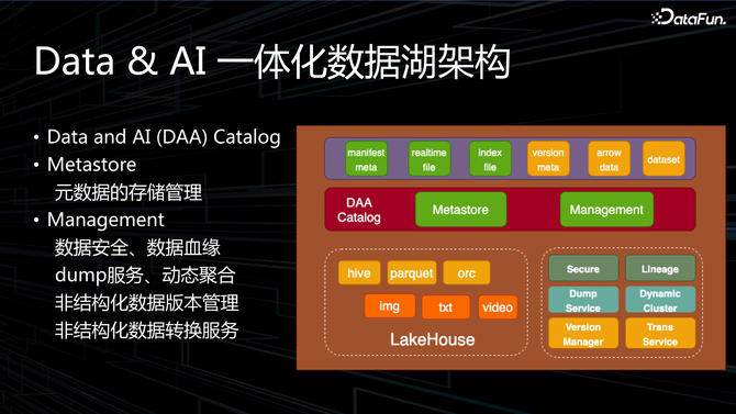 DAA Catalog 主要包括两个模块:Metastore 和管理模块。Metastore 类似于 HMS,主要解决元数据生命周期管理的问题。管理模块的功能主要包括:数据安全和数据血缘、dump 服务和动态聚合、非结构化数据的版本管理,以及非结构化数据的转换服务。