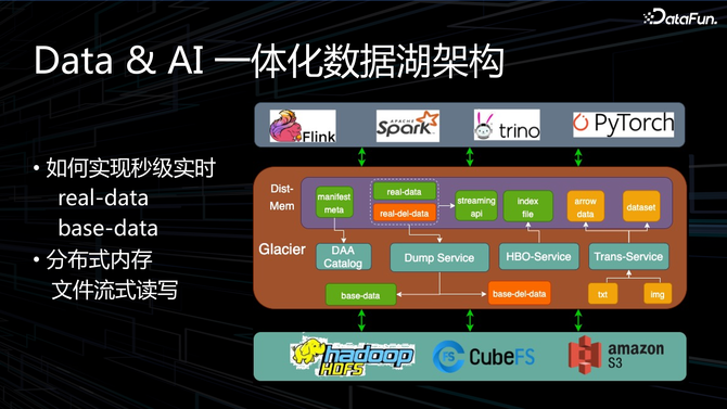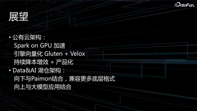 另外一个方向是 Data & AI 湖仓架构,很多业界顶尖公司都在推动这一理念。但是元数据管理存在痛点,活跃度低的表仍需解决冲突问题,向上与大模型应用结合。半结构化数据通过统一接口访问,封装了 dataset 的接口,向下需与 Paimon 结合,兼容更多底层格式,方便用户查找和训练数据。