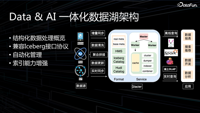结构化数据的处理最初是基于 Iceberg,目前可兼容多种接口协议。自动化管理包括cluster、dumper、indexer、combiner 等。另外对索引能力也做了增强。