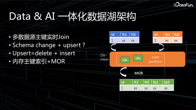 上图展示了一个比较特殊的案例,是搜推业务在实时样本拼接时遇到的一个问题,HBase 成本较高,且性能也不能满足需求。提出的解决方案是多数据源主键实时 Join。涉及到的样本数据,单条数据量比较大,平均一兆左右,把数据的索引放到分布式内存中,数据实时过来后在内存里的 hash partition 找到相关的索引去拼接,类似于 MOR 机制。