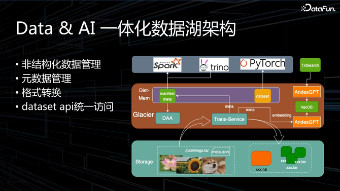 非结构化数据的管理,主要问题在于元数据,我们希望非结构化数据能够像结构化数据那样方便地使用。另外一个问题是数据格式转换,有些处理方式还比较原始,落到湖上之后会有 Trans-Service,例如将图片数据转换成 h5 或 dataset 格式,dataset 格式参照 Updataset 协议,提供一个统一的上层 API。