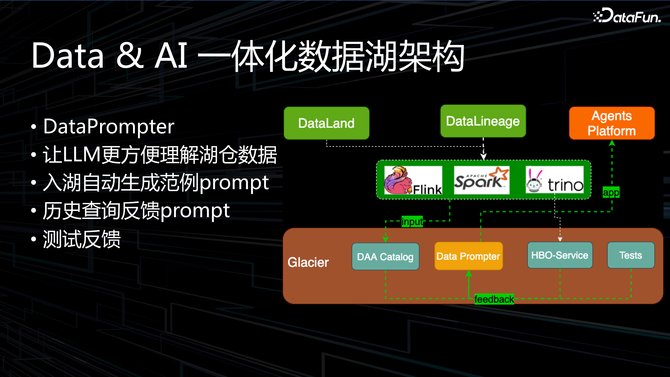 DataPrompter,在公司内部的聊天系统中,在对话框里 @机器人可以很方便地查询各种数据指标。开发过程中遇到的问题是,每输入一个表格,需要人工编织很多详细的 prompt,使 GPT 更好地去认识数据,写更精准的 SQL,海量的数据需要一个一个地制作 prompt,这就会构成瓶颈。入湖之后,根据元数据包括一些普通的信息都自动生成转换范例 prompt,从而使大模型能够更好地理解湖仓上的数据。