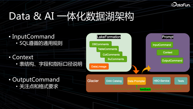 数据入湖阶段,大语言模型为更好地写出更精准的 SQL,会把 SQL 的规则编写到prompt 里面。另外,表结构、字段和指标口径说明打开直接写进去。模型输出OutputCommand 关注点和格式要求,输出 SQL 对应写法要求和标准。