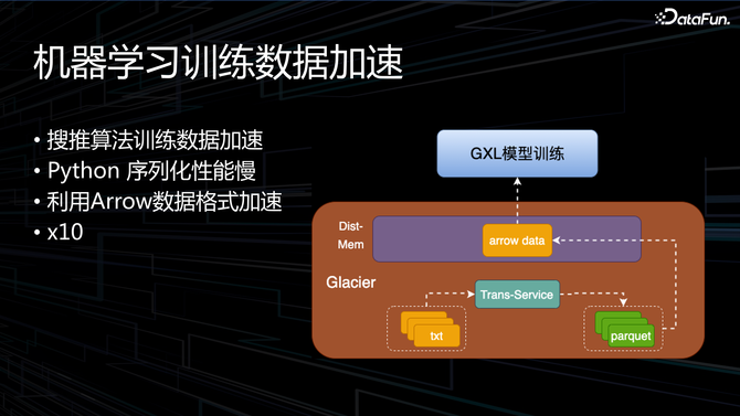 下面介绍机器学习训练湖仓数据加速的方法。首先是搜推算法训练数据加速,很多数据是裸的文本数据,txt 格式,上层的 Python 读取的时候会涉及到序列化性能慢的问题,我们将文本数据转换为 Parquet 格式,并使用 Arrow 库来读取。经过线上测试,性能会有 10 倍的提升。