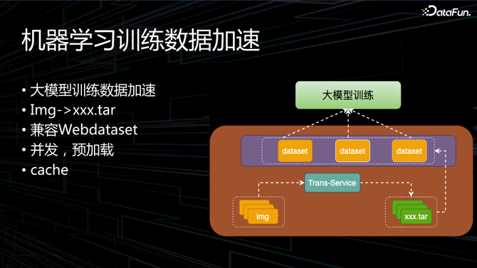 大模型的训练加速,会将裸的图片数据转换成分割好的 tar 包的 Dataset 的数据格式,通过缓存加速大模型训练数据的读取。训练时图片数据加载还是个瓶颈,图片数据的数据量比较大,如果用比较大的 tar 包性能会比较差。通过转换为小的 dataset 能得到数倍的性能提升。