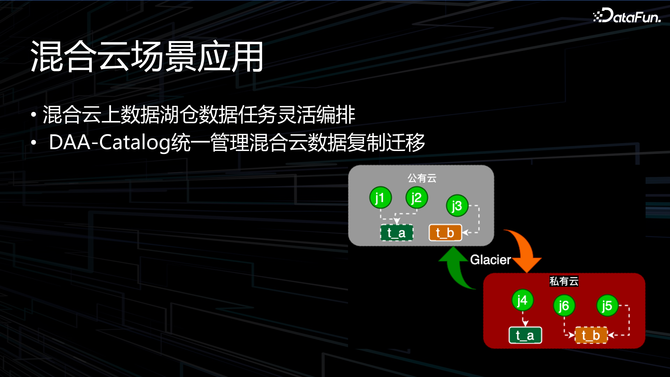 混合云在印度业务中有使用,但由于没有太多算法的业务,机器规模较小。以混合云上数据湖仓数据任务灵活编排。DAA-Catalog 统一管理混合云数据复制迁移。