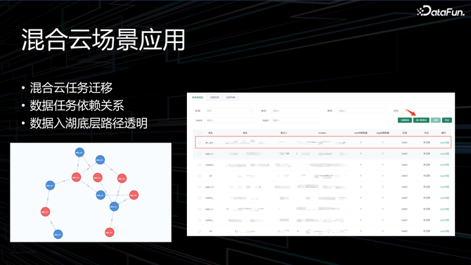 通过混合云模式,混合云数据任务迁移中,带宽是主要的瓶颈,迁移的时候通过找到数据和计算对带宽依赖最小的子图的方式去迁移,同时也会考虑底层的数据一致性,使得数据入湖底层路径透明。