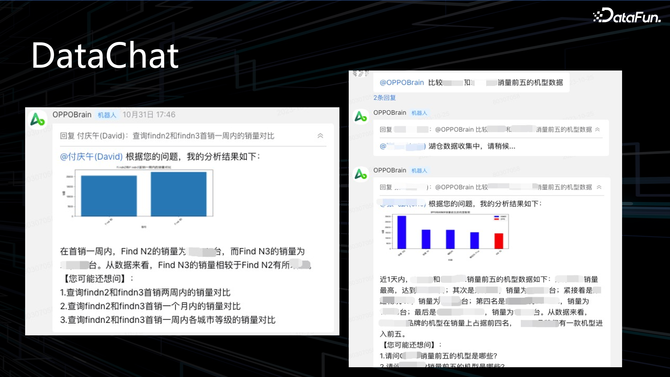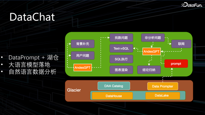 DataPrompt 落地的情况,Datachart 架构流程如图,底层是湖仓的数据,先确定是否为数据分析问题然后转化为 SQL 执行,数据在湖仓上解决不了的话就联网分析。Glacier 湖仓服务会找到这个表的 Prompt 推给大语言模型,进行自然语言数据分析。