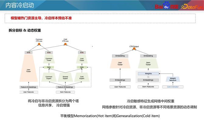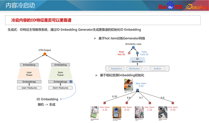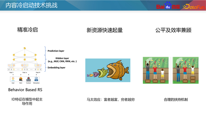 首先是精准推荐的挑战。随着过去十多年来推荐算法的发展,从最初的矩阵分解到后来的深度学习的广泛应用,ID 类特征在模型中的作用日益凸显。然而,由于新资源冷启动样本数量稀少甚至不存在,导致 ID 类特征在冷启动样本上的训练不充分,从而影响了推荐精准度。