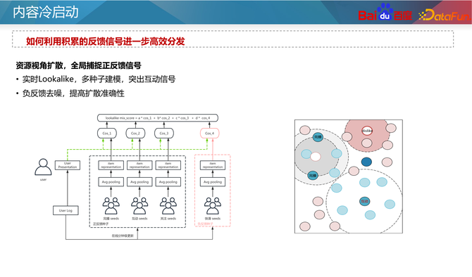 Lookalike 的一个重要优点是其实时性特别高。这个方法主要源自互联网广告领域,以前广告主会选择一些可能感兴趣的用户作为种子用户,然后系统会寻找这些种子用户的相似用户进行扩散。在推荐系统中,我们可以订阅在线实时流日志,获取之前冷启动时收集到的给予资源的正反馈,比如点击、播放、互动、关注等,甚至包括负反馈,如快速滑动的用户。然后基于这些种子用户,系统可以通过用户的 embedding,并通过各种汇聚方法或添加一些自注意力机制等,得到 item 的表示。这个表示可以非常快速地进行更新,再基于这个表示向外扩散,具有非常高的时效性。