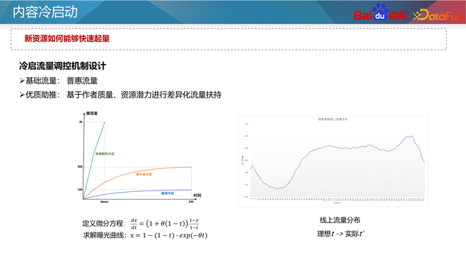 具体到公式上,公式中的 t 表示当前发布时间除以目标所需时间的归一化,即当前的时间进度,x 表示当前的分发进度。我们希望 t 和 x 相等,这意味着正常进度下的分发。如果 x 小于 t,则说明当前的冷启动速度较慢,需要增加权重或强插的系数。公式中的 θ 可以控制资源前期投放的倾斜程度。