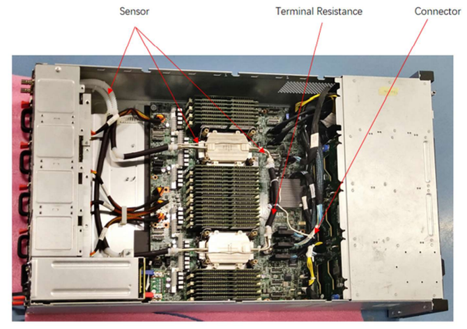 泄漏传感器部署在机箱中的不同位置,并通过固件和硬件配置,实时监测液体泄漏,可以第一时间确定泄漏的发生位置,并通过服务器自我保护设计实现自动保护和报警。