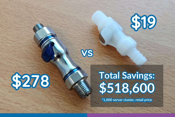 通过采用价格低廉的通用连接器套件,替代价格昂贵的无滴液连接器,在一个包含1000个服务器的集群中(每个服务器2套连接器),连接器的成本可节约高达51.9万美元。
