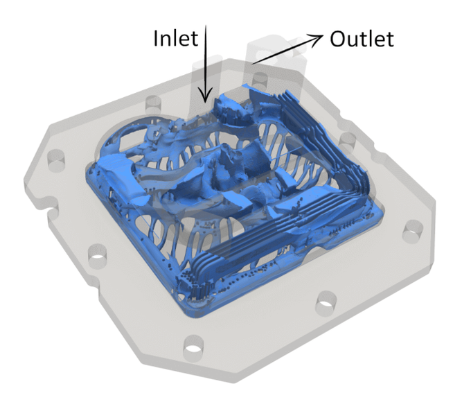 另外,3D 打印冷板技术支持生产更复杂的几何形状,在热交换和液体压降方面能获得更好的性能。通过结合拓扑优化的生成式设计,Diabatix的研究案例表明,与传统的车削翅片冷板相比,生成式3D打印铜冷板的热阻降低了 55%。