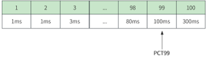 笔者推荐的系统性能的衡量指标是响应时间PCTn统计方式,PCTn表示请求响 应时间按从小到大排序后第n分位的响应时间。假设在一段时间内100个请求的响应时间从小到大排序如图所示,则第99分位的响应时间是100ms,即PCT99= 100ms。
