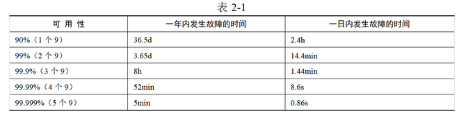 可用性=系统正常运行时间/系统总运行时间,表示一个系统正常运行的时间占比,也可以将其理解为一个系统对外可用的概率。我们一般使用N个9来描述系统的可用性如何,如表所示。