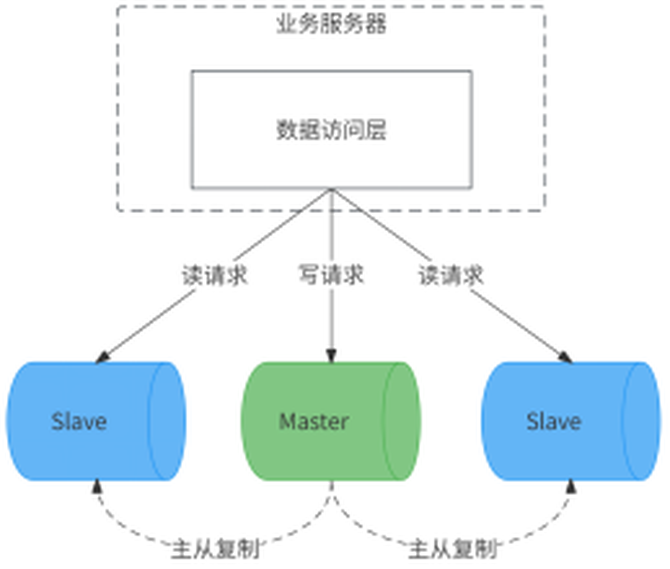 我们通常使用数据库主从复制技术实现读/写分离架构,将数据库主节点Master作为“写库”,将数据库从节点Slave作为“读库”,一个Master可以与多个Slave连接,如图所示。