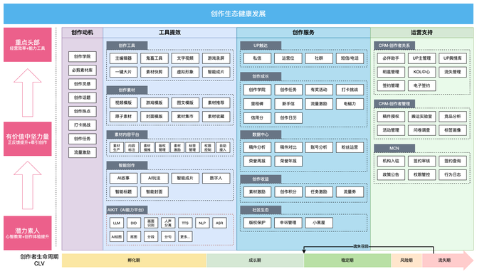 UP主创作服务为创作者提供充分的创作条件和服务支持,从而为平台提供优质创作者和优质UGC内容的供给,让更多有价值创作者产出更多有价值的内容实现平台内容生态供给侧健康增长。