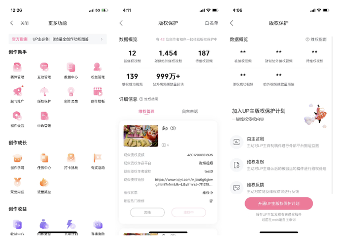 2021年B站推出“UP主版权保护计划”,正式为B站个人创作者提供跨平台侵权稿件检测保护B站创作者的原创作品。加入该计划后,UP主可主动将原创稿件纳入监测范围。B站会自动展示站外侵权视频链接以及侵权视频预估播放量,并自动监测新增原创稿件的侵权情况。