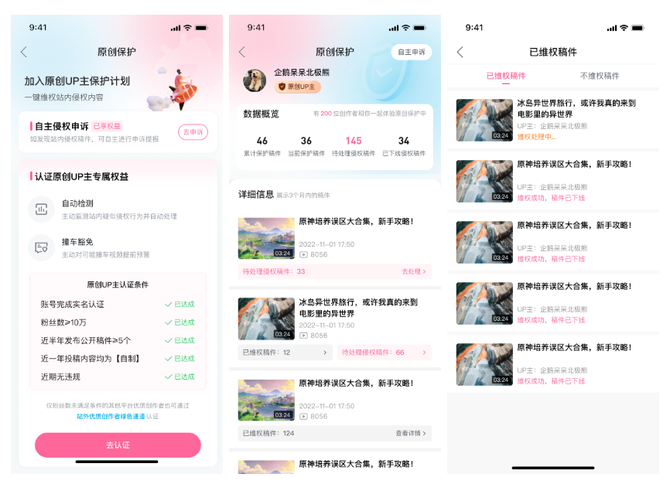 以上是针对站外搬运侵权的保护举措。为补齐站内原创保护能力,降低侵权稿件数,保护创作者权益提升创作体验,B站在【版权保护】的基础上推出【原创保护计划】,增加站内原创UP主身份认证,认证通过的UP主纳入站内保护计划,站外优质创作者提供绿色通道快速加入。