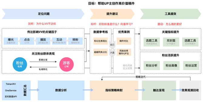 创作任务体系是通过平台的扶持和引导,通过目标激励牵引UP主创作有消费价值的稿件,孵化出更多有影响力的UP主(高粉,甚至百大),在过程中不断形成良好的创作生态。根据UP主过往的消费和投稿行为,打造UP主专属的选题推荐和视频分析,带动“创作共鸣”,继而加速产出好的作品和涨粉。后续还将改造“成长任务”,引导UP主完成阶段性的学习,从而提高创作能力和后续的商业化探索。