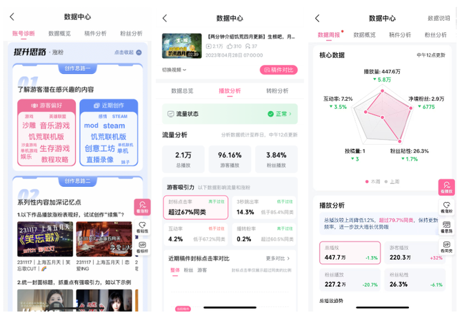 进入稳定期的创作者在内容制作和动力上已经不成问题,如何持续精细化的运营粉丝私域和追求进一步的圈层突破是这部分创作者的主要痛点,创作数据中心对创作者稿件和账号双视角纵横双向分析,帮助他们深入了解账号和稿件的表现,优化内容创作和账号运营策略,提升内容创作质量,增强与粉丝的互动。
