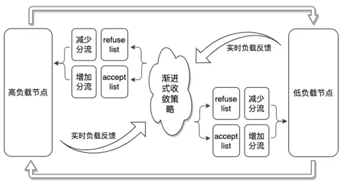 基于节点相关状态信息反馈,实时调整分流策略,进而达到期望指标的均衡。