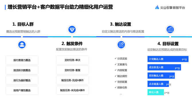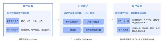 火山引擎营销套件产品,涵盖了增长分析平台 DataFinder、A/B 测试平台 DataTester、客户数据平台 VeCDP、增长营销平台 GMP 等全链路用户增长和业务营销工具,已经为业内多家大模型应用公司提供了全方位的增长营销解决方案。