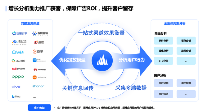 ● 推广获客:增长分析平台可提供全面的主流渠道效果评估,帮助优化广告投放 ROI。同时支持多端埋点,搭配完整的分析工具,全面洞察用户在应用内的转化、流失、留存等数据表现。