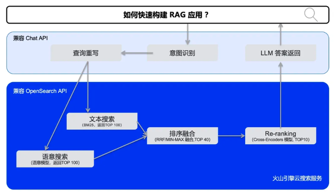 为了应对复杂需求,火山引擎云搜索端到端的解决方案,提供的是一个完整的 RAG 生态,能够将火山引擎已有的搜索的经验运用起来,比如 RAG 搜索的召回率提升,ES 的插件化能力,干预能力,以及基于 LangChain 或其他模型所不具备的抽象搜索和检索重排功能。