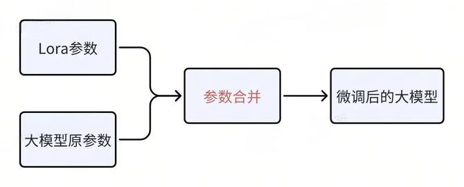 我们之前提到,Lora参数实际上是将大模型的其余参数冻结后剩下的部分。Lora参数本身也是大模型参数的一部分,通常占比小于整体的2%。将微调后的Lora参数与大模型的原始参数合并后,就可以生成一个新的微调大模型,之后只需直接部署这个新模型即可。