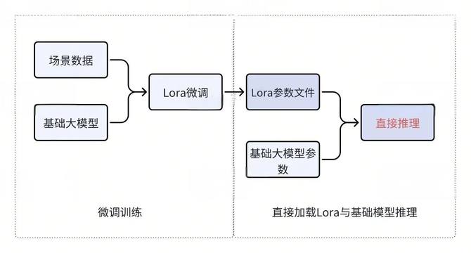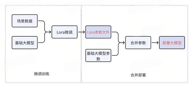 对于每个业务场景,我们首先通过微调训练生成一个Lora参数文件,然后将Lora参数文件与基础大模型合并,最后进行大模型的部署。这是一个经典的流程。