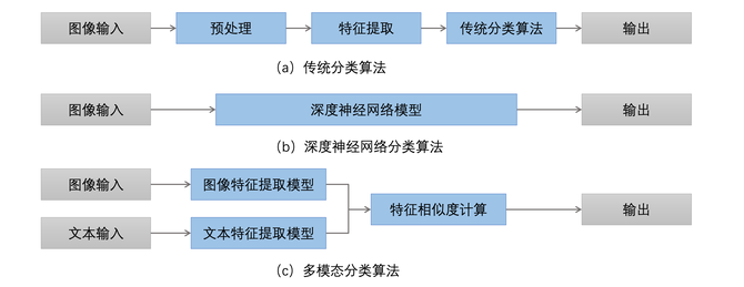 传统的图像分类方法通常使用 SIFT(Scale Invariant Feature Transform,尺度不变特征变换)、HOG(Histogram of Oriented Gradients,方向梯度直方图) 等技术,从图像中提取出关键信息,如颜色、形状和纹理。再使用SVM(Support Vector Machine,支持向量机)、决策树、随机森林、K近邻算法和朴素贝叶斯等方法对标注好的训练数据进行分类训练。尽管这些算法在某些任务上取得了较好的效果,但它们通常需要大量的手工调整和参数优化,且在处理大规模图像数据集时,性能有限。随着深度学习技术的快速发展,CNN(Convolutional Neural Networks,卷积神经网络)作为一种端到端(end-to-end)的模型,能够通过卷积、池化、全连接层等操作,从数据中学习到更加丰富的特征表示,无需手动设计特征和分类器,可以获得更好的分类效果。然而大多数基于深度学习的算法均需要大量的标签数据进行训练,而公开的数据集并不一定适合实际业务场景,因此需要人工收集和标注更适合业务场景的大规模数据集。