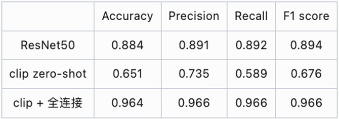 训练输入尺寸设置为 224 × 224 ,在 RTX 3090 上进行单机单卡的训练。将 ResNet 50 训练 300 个 epoch(每个 epoch 是对训练集中的全部样本训练一次),大约为 180 分钟。而在相同条件下,对 clip 结合全连接层训练 600 个 epoch ,仅需约 125 秒即可收敛。我们从准确率(Accuracy)、精确率(Precision)、召回率(Recall)、F1 分数(F1 score)四个维度对包含 clip 的 zero-shot 方案在内的三种方法,在相同验证集上进行对比。验证结果如表1所示,基于 clip 结合全连接层的方案在各项指标上都明显优于 ResNet 50 和基于 clip 的 zero-shot 方案。若在实际业务中对准确率要求不高且没有足够的训练数据时,clip 的 zero-shot 方案可能是一个合适的选择。