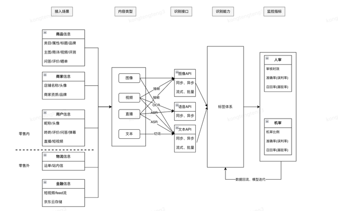 合规域在电商平台中扮演着重要的角色,它相当于电商体系中的“免疫系统”,通过识别恶意的商品、商家以及UGC内容,确保电商生态的健康、有序和可持续发展。因此我们部门致力于打造业内领先的内容理解与审核平台,在具体工作中,通过识别并治理商家在产品、价格、服务维度的违规行为以及短视频、直播、评价、问答等内容的违规信息,降低审核成本、提升运营效率,并最终保障用户体验。