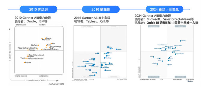 2024年6月,全球权威的IT研究与咨询公司Gartner发布了2024年数据分析和商业智能魔力象限市场分析报告,Quick BI作为连续五年入选榜单的产品,今年继续巩固了在魔力象限中的挑战者地位,并且位置仍在稳步提升。