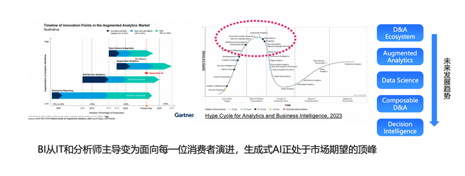 Gartner定义的技术发展成熟度曲线用来展示和衡量技术从萌芽到成熟的发展阶段。曲线中被红虚线圈住的这一部分是目前临近或者处于期望膨胀期的技术,里面有很多是跟AI相关的,比如NLQ、NLG、增强分析、可解释的人工智能、数据叙事等等。这些技术到达成熟的预期时间都是两到五年内,它们的出现显著加快了敏捷BI向智能演化的速度。