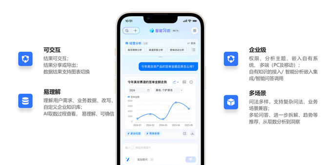 智能问数功能通过自然语言交互直接获取数据结果,基于NL2SQL技术开发,它的主要特色包括: