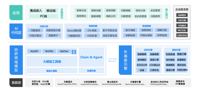AI中间层:位于上层应用和大模型之间,主要负责任务分发及协同工作,确保模型和BI系统的高效配合。AI中间层还提供了一套自定义的标准结构化语言DSL,为大模型定义了一套可掌握的API语言,通过构建DSL语言,完成了AI和算子操作的对接,使得围绕数据编写的大模型应用更加具备可确定性,避免了自然语言输入带来的应用表达不稳定问题,将BI领域大模型的应用编程变成了确定性的编程。