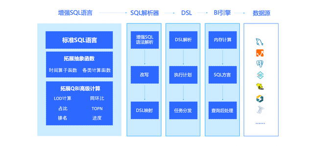BI基座引擎:作为支撑小Q的重要组成部分,BI基座引擎保证了整个数据分析的强复用性,承载了从数据连接建模到复杂的高级计算和分析的能力,为数据分析提供了强大的底层支持。